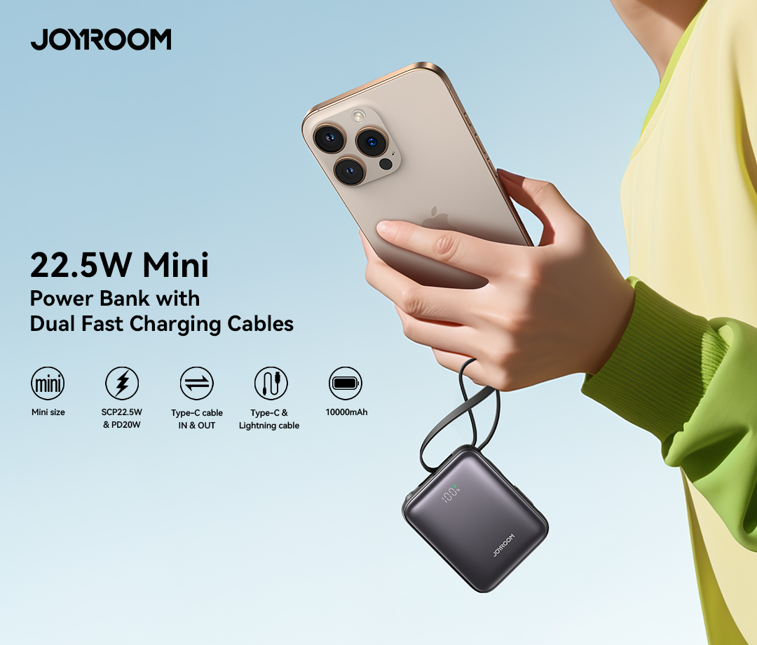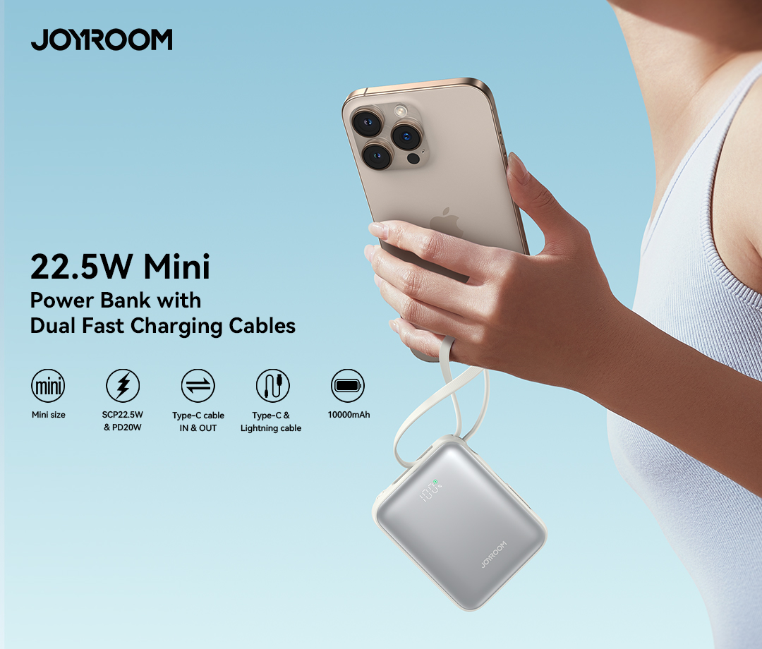 Compact yet powerful, the Joyroom JR-PBF27 features a 22.5W SCP & 20W PD output, dual built-in cables (USB-C & Lightning), and a USB-C input/output port. With a sleek mini design, digital battery display, and 10000mAh capacity, it’s perfect for fast, on-the-go charging. Includes a 0.25m USB to Type-C cable. Lightweight and pocket-friendly—available in Black and White to match your style.