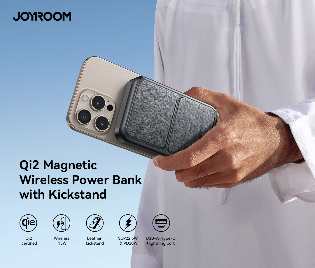Charge smart and hands-free with the Joyroom JR-PBM11, featuring Qi2-certified magnetic wireless charging up to 22.5W, a sturdy kickstand, and a 10000mAh capacity. Enjoy stable power delivery via USB-C port and included 60W USB-C to USB-C 0.25m cable. The compact design makes it ideal for MagSafe-compatible iPhones and Qi-enabled devices. Slim, strong, and stylish—perfect for on-the-go use with added convenience and power.