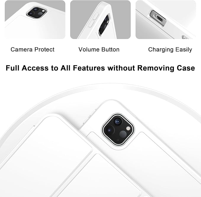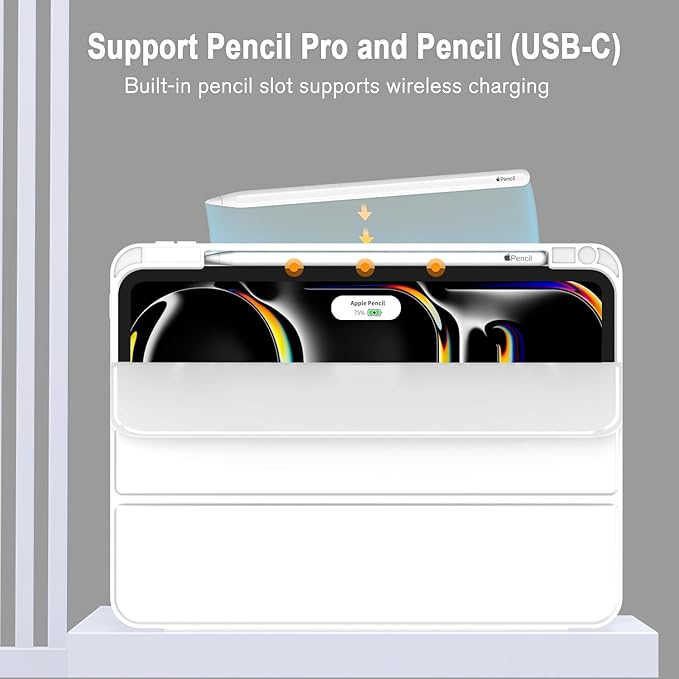 This protective case is designed exclusively for the 2024 iPad Pro 13-inch M4 (7th Generation) and is not compatible with other iPad models—please check your device’s model number before purchase. It fully supports the Apple Pencil Pro and Pencil (USB-C) with a recessed side groove for magnetic charging and a secure magnetic clasp to keep your Pencil in place. The magnetic smart cover enables convenient auto sleep/wake functionality and features a strong magnet for easy snap-on and closure. Crafted from a durable PU exterior, soft TPU back cover, and microfiber lining, this case offers full-body protection against shocks, drops, and scratches. With dual standing positions, users can adjust their iPad to comfortable viewing angles. Available in classic black and white.